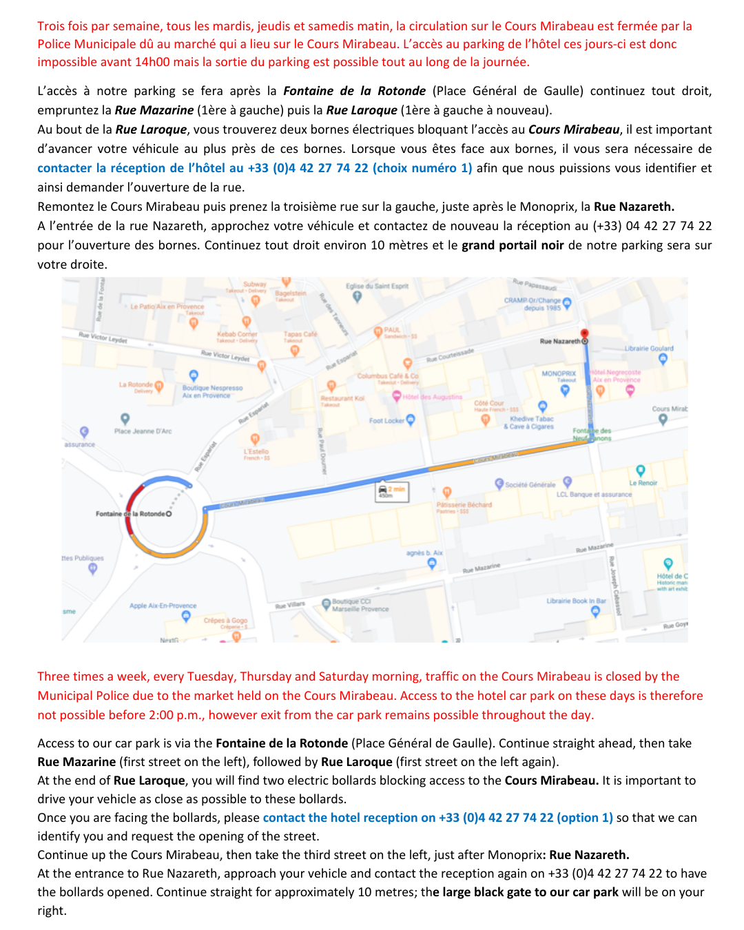 Every Tuesday, Thursday, and Saturday morning, traffic on the Cours Mirabeau is closed by the Municipal Police due to the market held there. On these days, access to the hotel car park is therefore not possible before 2:00 p.m., but exit from the car park is possible throughout the day.